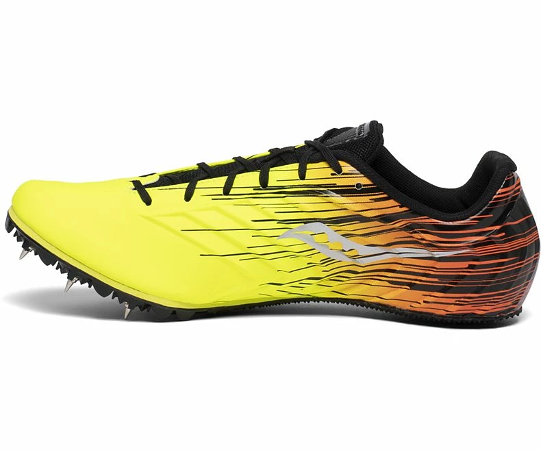 The new Saucony Spitfire is sleek, fast, and unique. With a styling like no other, the Spitfire is ready to do some damage. With a 7 pin spike plate, you will surely be able to get great traction and speed. The synthetic upper and molded quarter cage will provide a secure fit so you can have a smooth quick race.